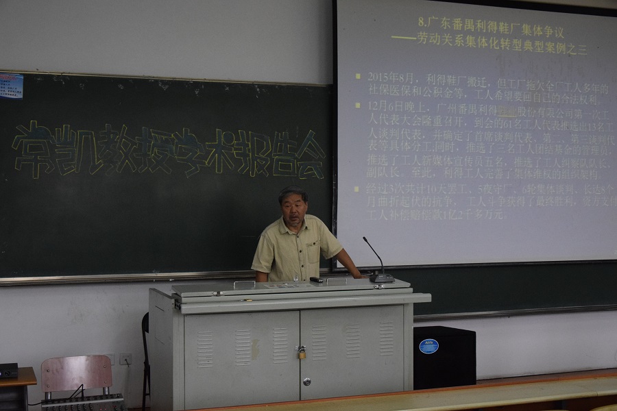 于六月十四日有幸请到了中国人民大学劳动人事学院教授、博士生导师、中国人民大作劳动关系所所长常凯,为我院学生做一场有关和谐劳动关系建构与政府规制的学术报告。