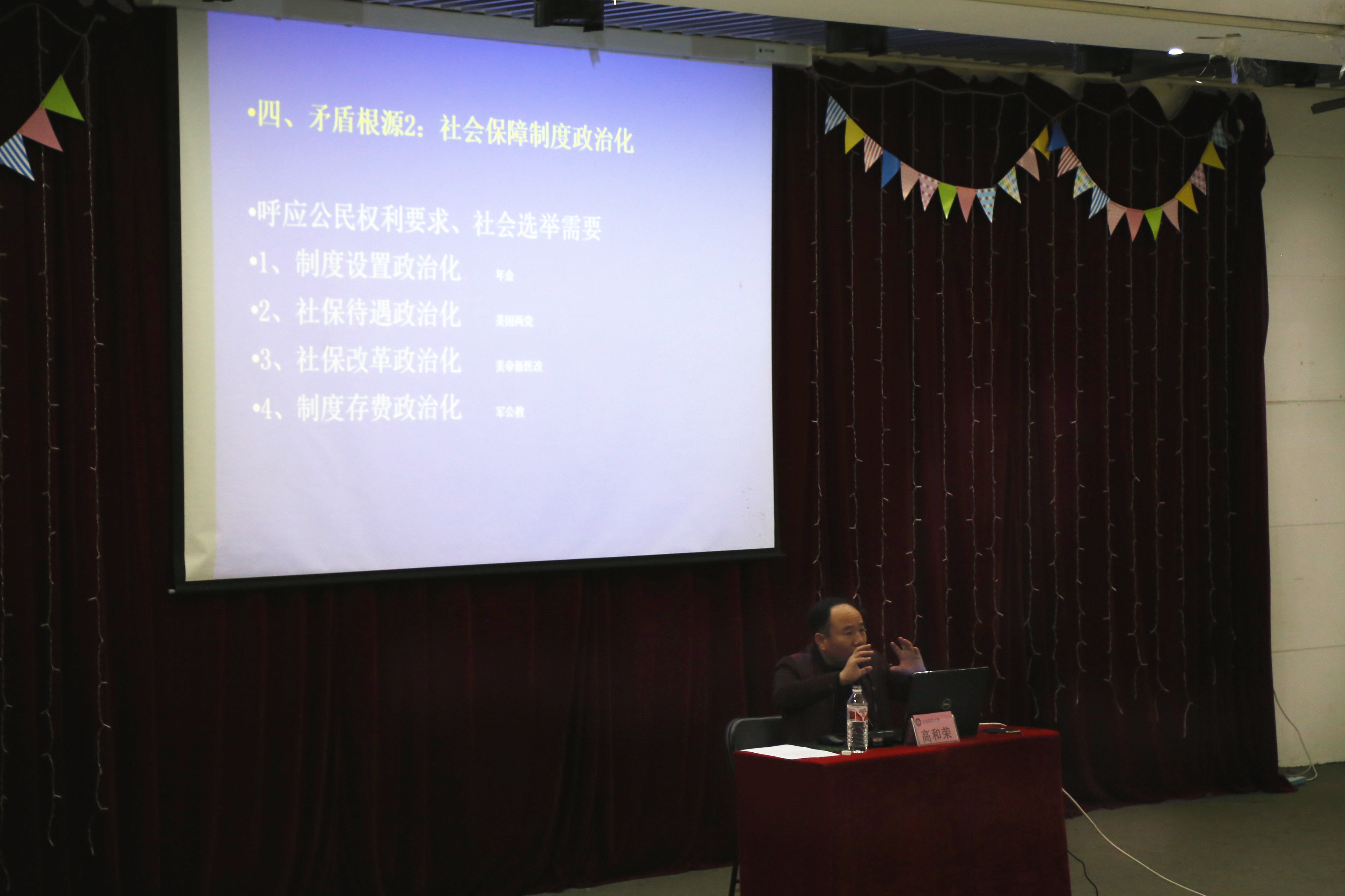 在讲座中,高和荣教授分别从教育,医疗和养老三个方面展开讲解,他用幽默生动的授课语言,加以他在调研中的实例举例,从最真实的角度解读了我国现在社会保障的利弊。在讲座中高和荣教授讲到一方面所有国家的社保体制都只有增加,从未有过削减。高和荣教授肯定了我国改革开放之快社会保障发展之快,成就显著,实现了统筹结合,从制度全覆盖发展到人员全覆盖,实现了与经济发展的同步增长。