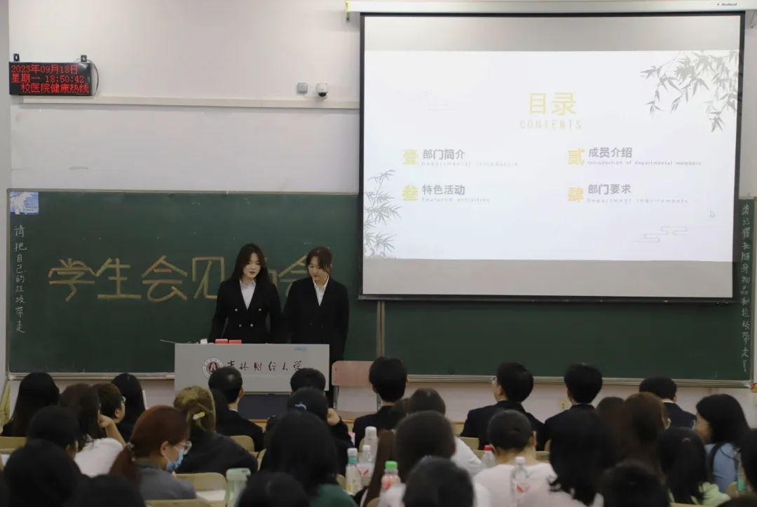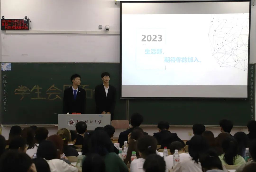 会议伊始,学生会主席团对学生会工作的主要内容做了简要概括,随后各部门逐一上台进行宣讲。宣讲顺序为主席团、分团委、秘书处、生活部、青马小组、新闻科技部、新媒体编辑部、宣传部、社团部、实训部、文艺部、外联部、体育部、学习部、自律委员会、心泉志愿者协会。各宣讲人根据精心准备的PPT介绍了部门成员、主要工作,通过幽默诙谐的语言展现了各部门的特色并热情地与新生们互动,为他们答疑解惑,宣讲过程中新生们兴趣斐然,表现出了加入学生会的极大热情。宣讲结束后,各部门负责人邀请2023级新生加入纳新群进一步了解相关情况。