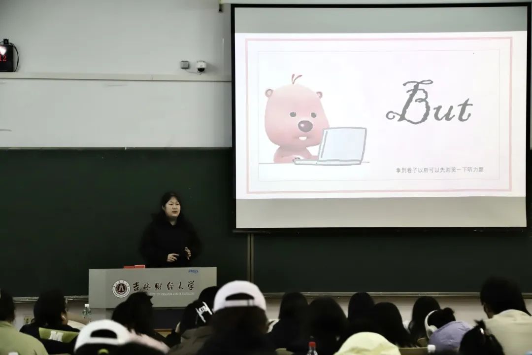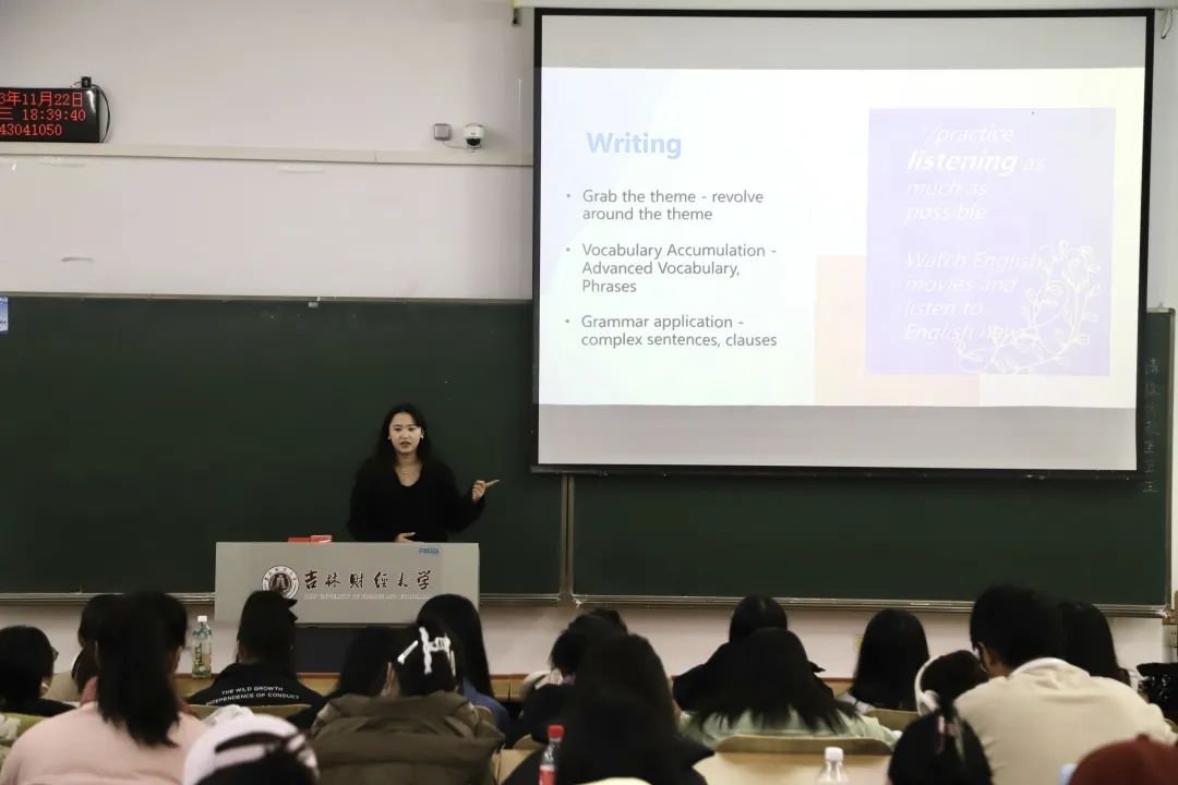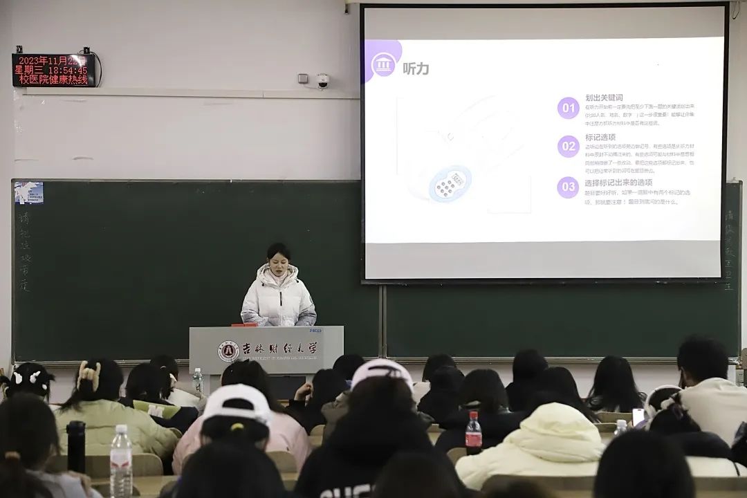 首先由赵宋鑫学姐和姚思桐学姐进行了自己的过级经验分享,学姐先是介绍了题型,随后对各个题型进行了分析。在听力部分,学姐总结最根本的技巧便是“所听即所选”,它并不像六级那样需要分析具体说了什么,但是在最开始练习的时候会很辛苦,这就需要我们持之以恒。一套真题最少要听三遍才能吃透:第一遍进行泛听,在规定时间内把25道题从头到尾做完并完成涂卡的工作,模拟真实考试的状态,锻炼考场应变能力;第二遍进行精听,将之前没听懂的地方找出来,仔仔细细弄清楚原因;第三遍参照原文听,找到答案所在之处,总结规律,并把听力原文中所有生词查出来、记下来。在听力练习的时候还要注意分值,像passage这种模块分数很高,做到这里时一定要保持清醒、别走神。长此以往的坚持练习,不出半个月便会有质的飞跃,但这一过程需要我们的耐心和细心!
