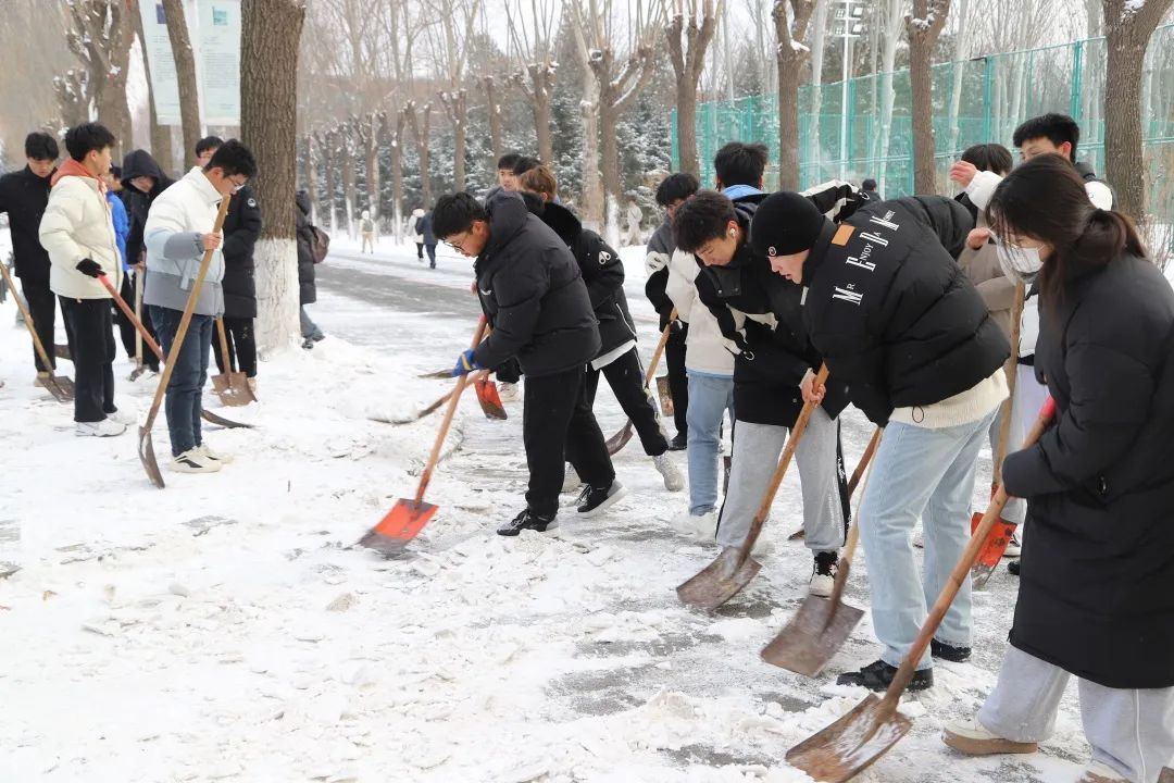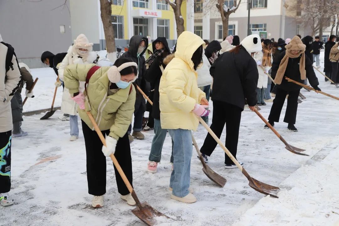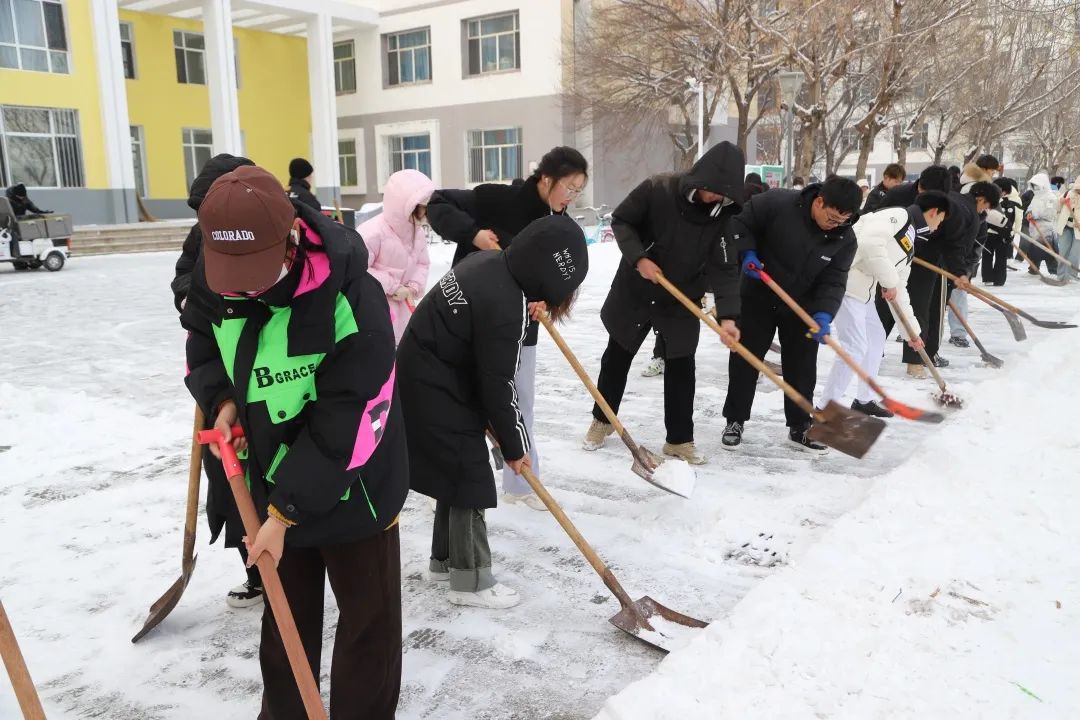 活动中,全体学生手持铁锹、雪铲等工具,分工明确、划区进行,积极参与到扫雪破冰行动中去。即使有凛冽刺骨的寒风也挡不住学生们除雪的热情,在白雪皑皑的一方天地,学生们通红的脸颊彰显劳动教育的风采,展示团结一心、共克雪阻的精神面貌,成为校园中一道亮丽的风景线。