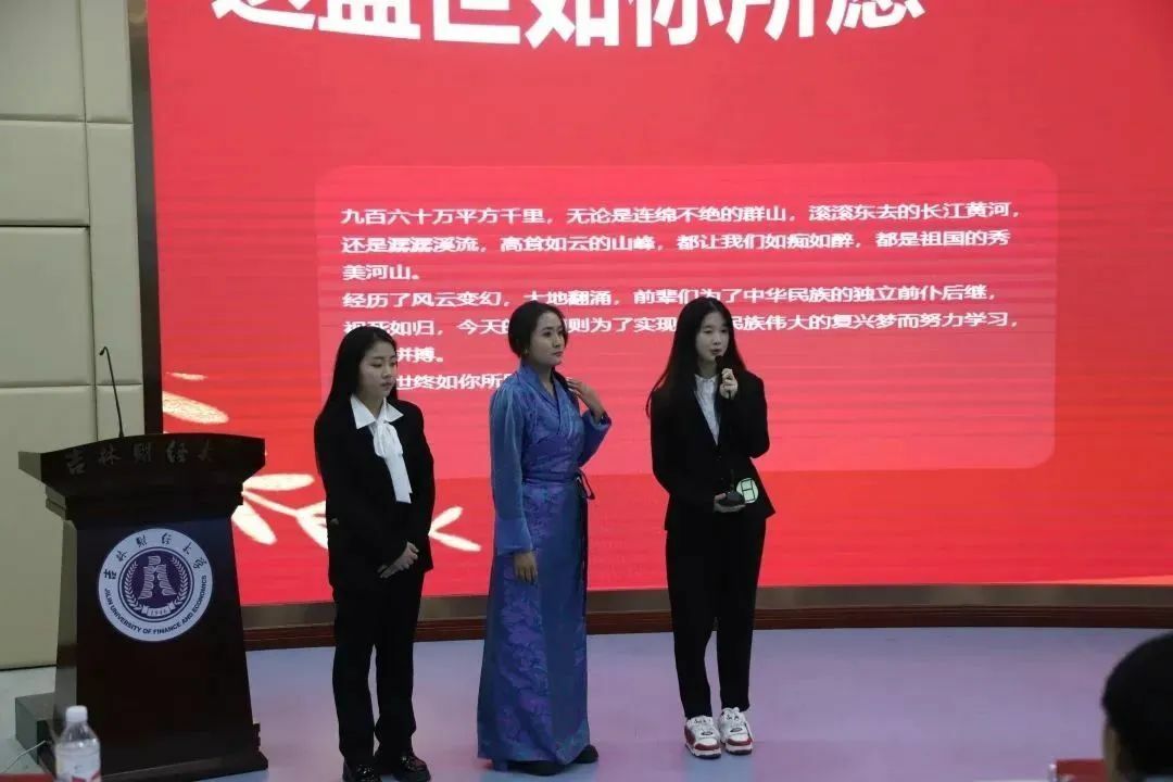 第二轮为三组选手以“山河锦绣,国泰民安”为主题进行小组展示。九位选手由抽签的形式分为三个小组进行小组展示,每一个小组都由摄影组、绘画组、书法组各一名选手组成。三位选手合作完成一幅作品,共同进行作品展示和作品讲解。通俗的讲解和生动的语言让我们深切感受到各种艺术相结合的美感,也让我们了解到不同的风俗文化和祖国各地的大好河山。活动最后,由九位选手共同演唱歌曲《仰望星空》。