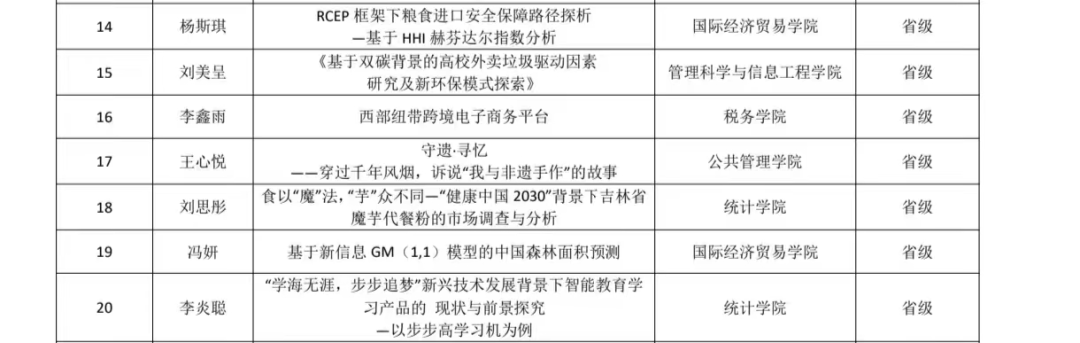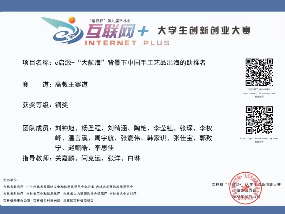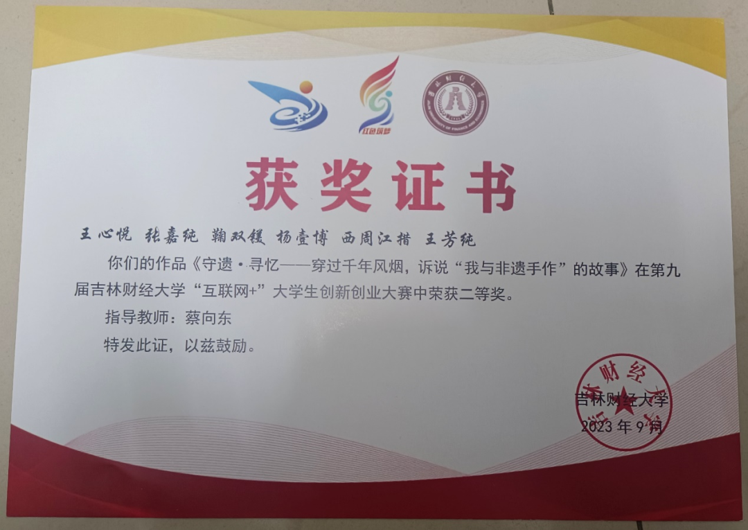 星光不问赶路人,时光不负实于者。经过努力的拼搏,以劳保2118班王心悦为负责人组建的团队在第九届吉林省“互联网+”创新创业大赛中获校级二等奖,在2023年大学生创新创业大赛中获省级立项;以劳保2118班彭麟植为负责人组建的团队在精创云管理学科竞赛中获校级三等奖;行政2219班李权峰作为成员在第九届吉林省“互联网+”创新创业大赛中获省级铜奖,在2023年大学生创新创业大赛中获省级立项。