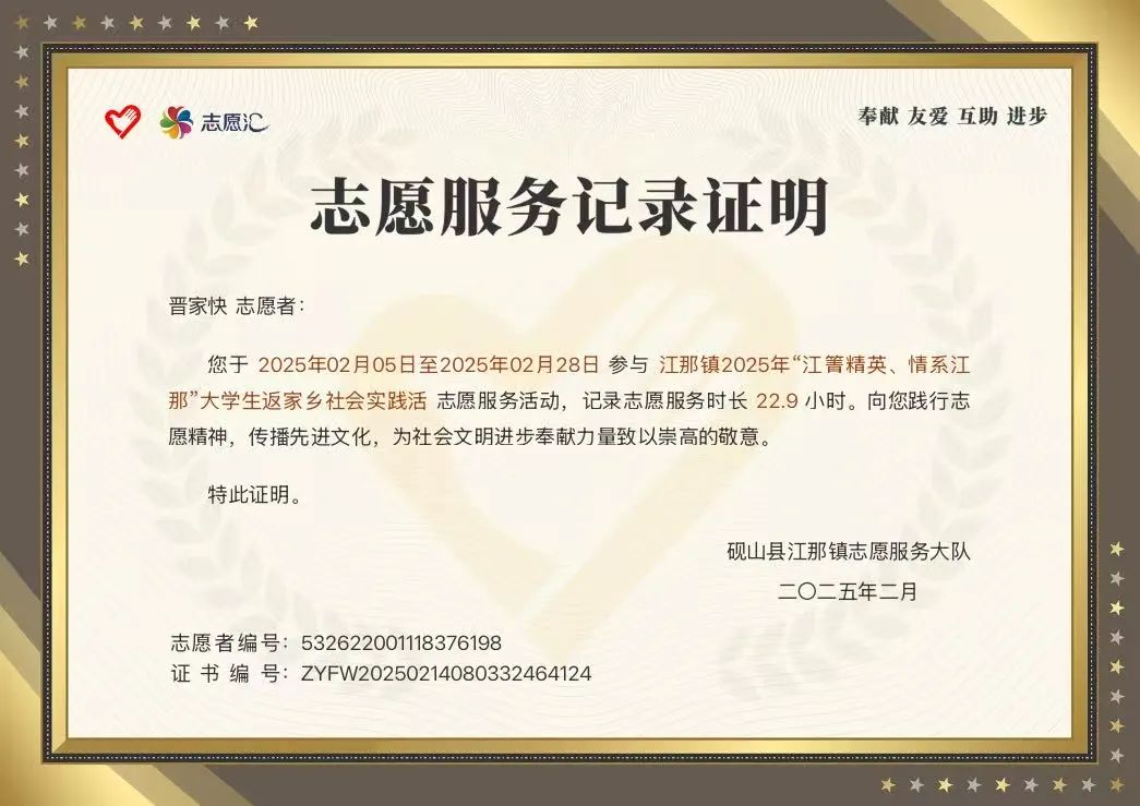 建设美丽家乡“我家洗砚池头树,朵朵花开淡墨痕。不要人夸好颜色,只留清气满乾坤。”参与返家乡社会实践志愿活动,是我成长路上一段意义非凡的经历,让我收获满满,也有了诸多深刻感悟。贴近群众,感受民生温度。在基层志愿服务中,我协助社区工作人员开展困难群众走访慰问。走进那些狭窄的小巷和老旧的房屋,我看到了生活的艰辛,也看到了群众对美好生活的渴望。他们的每一次道谢,都让我深刻体会到基层志愿工作的意义所在。这不仅是一份责任,更是一份沉甸甸的使命。收获成长,坚定理想信念。基层工作就像一个大熔炉,锻炼着我的意志,提升着我的能力。通过与群众的深入交流,我学会了如何更好地与人沟通,如何解决实际问题。这段经历让我更加坚定了投身基层、服务群众的理想信念,我希望未来能继续在家乡的土地上发光发热,为基层发展贡献自己的力量。事无巨细,磨炼耐心细心。基层工作繁杂琐碎,从邻里纠纷调解到环境卫生整治,再到政策宣传解读,每一件看似微不足道的小事,都关乎着群众的切身利益。在协助社区活动时,我需要向居民耐心解答他们的疑问。这让我明白,基层工作需要极大的耐心和细心,只有把小事做好,才能赢得群众的信任和支持。
