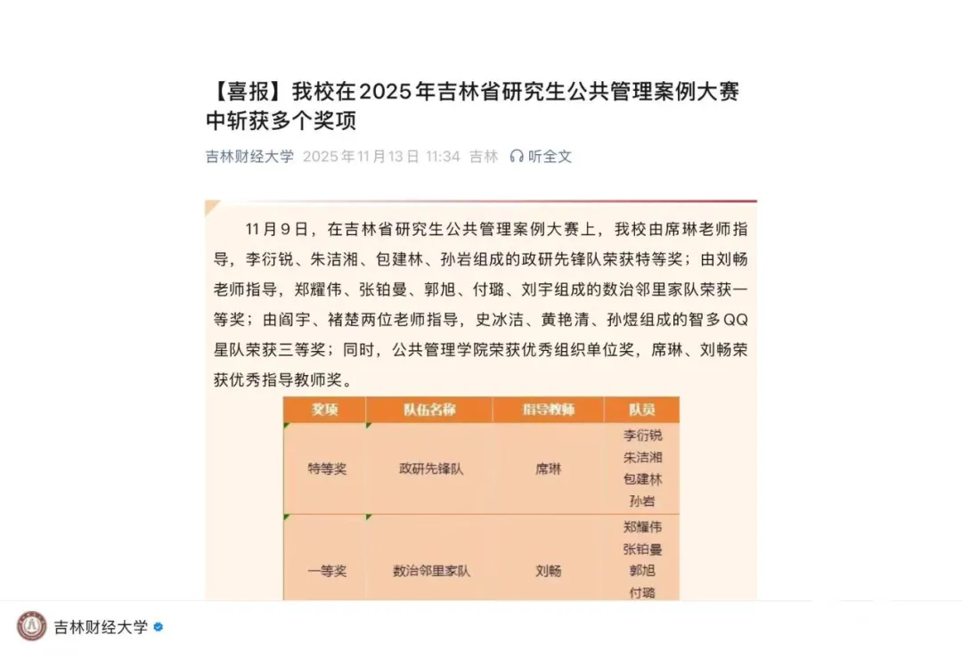 11月9日,在吉林省研究生公共管理案例大赛上,我院由席琳老师指导,李衍锐、朱洁湘、包建林、孙岩组成的政研先锋队荣获特等奖;由刘畅老师指导,郑耀伟、张铂曼、郭旭、付璐、刘宇组成的数治邻里家队荣获一等奖;由阎宇、褚楚两位老师指导,史冰洁、黄艳清、孙煜组成的智多QQ星队荣获三等奖;同时,杏吧原创 荣获优秀组织单位奖,席琳、刘畅荣获优秀指导教师奖。