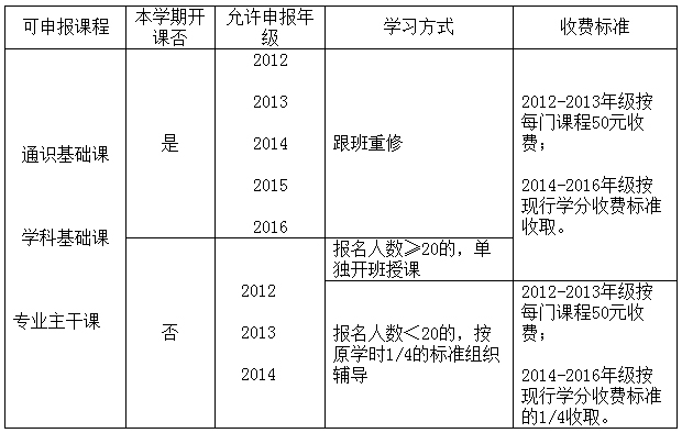 各年级学生: 现将2017-2018学年第一学期的重修报名工作有关事项通知如下:一、重修报名有关事项(一)必修课模块各年级可申报课程、学习方式及收费:(二)选修课模块各年级可申报课程、学习方式及收费: 可申...